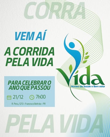 No dia 21 de dezembro, às 7h, em Francisco Beltrão – PR (R. Peru, 1213), acontece a Corrida pela Vida, um evento especial promovido pelo Núcleo VIDA para celebrar o ano que passou e reforçar a importância da saúde física e mental.